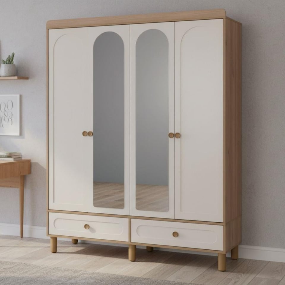 Gardırop, ortadaki 2 kapak aynalı olup, odanıza ferah bir atmosfer kazandırırken, aynı zamanda pratik kullanım imkânı sağlar. Alttaki 2 çekmece, küçük eşyalarınızı düzenlemek için ek bir depolama alanı sunarak kullanım kolaylığı yaratır.