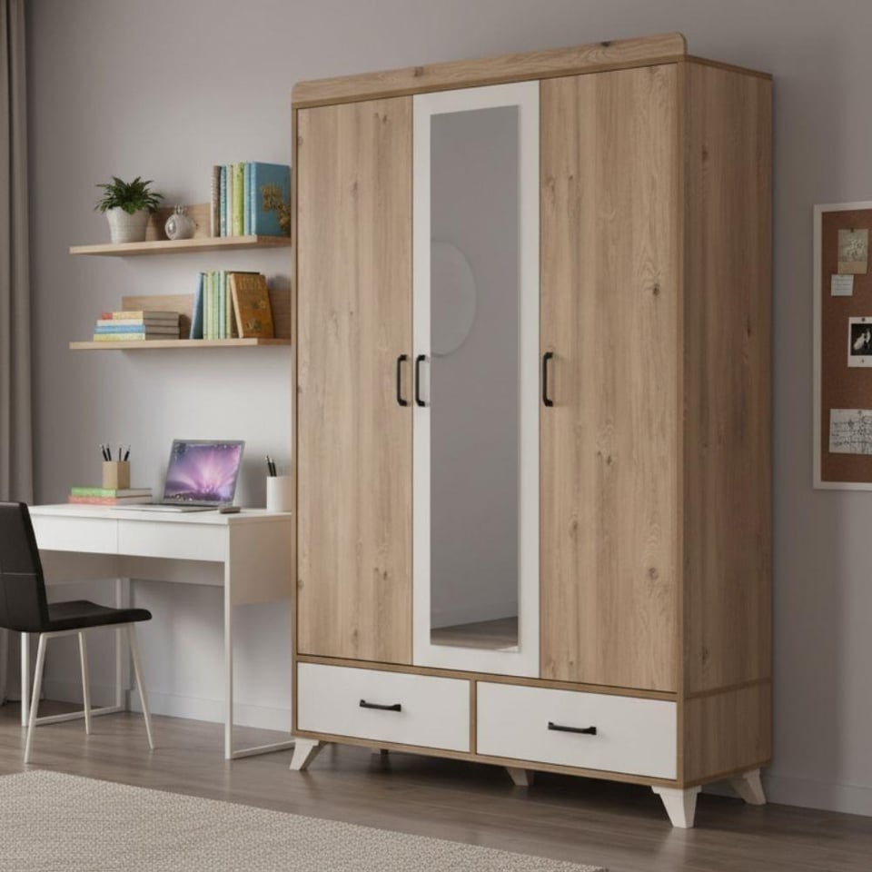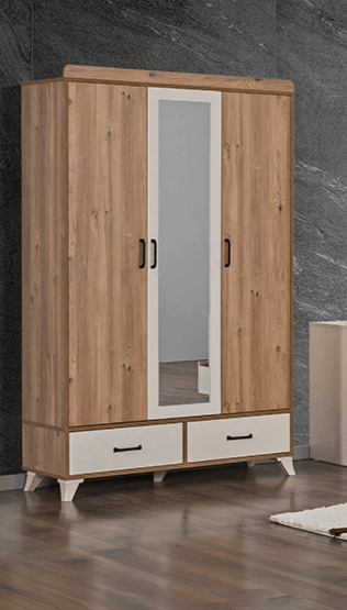 Geniş iç hacme sahip olan gardırop, giysi ve aksesuarlarınızı düzenli bir şekilde saklamanıza olanak tanır. Ortadaki aynalı kapağı sayesinde hem kullanım kolaylığı sağlar hem de mekânınıza ferahlık ve derinlik kazandırır. Alt kısmında bulunan iki çekmece, çorap, iç çamaşırı ya da küçük eşyalarınız için ideal bir saklama alanı oluşturur.