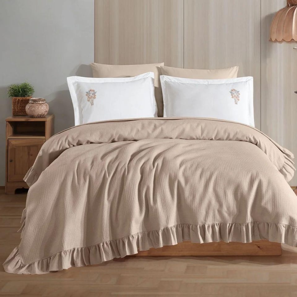 Modern çizgilerle zarafeti buluşturan Elart Bahar Pike Takımı, yatak odanıza estetik bir dokunuş kazandırıyor. Nakışlı ve fırfırlı detaylarıyla dikkat çeken bu 6 parçalık takım, hem günlük kullanım hem de özel anlar için ideal. Lastikli çarşafı sayesinde yatağa kolayca yerleşir, dört mevsim boyunca ferah bir uyku deneyimi sunar. Pratik ve şık yapısıyla, konforu ve zarafeti bir arada yaşamak isteyenler için harika bir seçimdir.