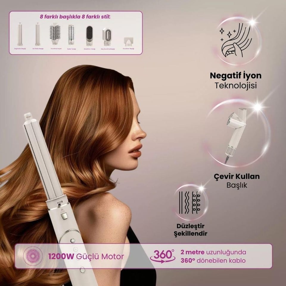 Mieco Aria 8 in 1 Saç Kurutma ve Şekillendirme Seti – Şampanya Renk Şıklığı Mieco Aria 8 in 1 Şampanya Saç Kurutma ve Şekillendirme Seti, hem kurutma hem de profesyonel saç şekillendirme için mükemmel bir çözümdür. Hafif tasarımı, güçlü motoru ve gelişmiş iyon teknolojisiyle saçlarınıza parlaklık ve pürüzsüzlük kazandırır. Üstelik Yiğit AVM’de kredi kartsız, elden taksit imkânıyla kolayca sahip olabilirsiniz! Profesyonel Performans, Ev Konforunda 1200W motor gücü sayesinde hızlı ve etkili kurutma sağlar. 18.000 RPM motor hızıyla şekillendirme süresini minimuma indirir. Negatif iyon teknolojisi ile saç elektriklenmesini azaltır, parlak ve canlı bir görünüm sunar. 2 ısı ve 3 hız kademesi ile saç tipinize en uygun ayarı seçebilirsiniz. Aşırı ısınma koruması güvenli kullanım sağlar, saç ve cihaz ömrünü uzatır. Ergonomik ve Kullanıcı Dostu Tasarım Katlanabilir gövde sayesinde kolay taşınır ve minimum yer kaplar. 420 gramlık hafif tasarımı ile uzun süreli kullanımda bile konfor sağlar. 360° dönebilen 2 metrelik kablo hareket özgürlüğü sunar. Sessiz motor teknolojisi ile rahatsızlık vermeden kullanabilirsiniz. Ekstra Aksesuarlar ile Tam Donanım Set içerisinde yer alan filtre, kablo koruma aparatı, temizlik fırçası ve taşıma çantası ile cihazınızı her zaman temiz, düzenli ve güvenli şekilde kullanabilirsiniz. Teknik Özellikler Özellik Detay Motor Gücü 1200W Motor Hızı 18.000 RPM Isı Ayarı 2 Kademe Hız Ayarı 3 Kademe Teknoloji Negatif İyon Teknolojisi Kablo Uzunluğu 2 metre, 360° dönebilen Ağırlık 420 gram Ek Aksesuarlar Filtre, kablo koruma aparatı, temizlik fırçası, taşıma çantası Renk Şampanya Güvenli Kullanım Uyarıları Ürün fişe takılıyken başlık değiştirmeyiniz. Cihazı suya temas ettirmeyiniz. Çocukların erişemeyeceği bir yerde muhafaza ediniz. Mieco Aria 8 in 1 ile saç bakım rutininizi kolaylaştırın, her gün kuaför kalitesinde sonuçlar elde edin. Şimdi Yiğit AVM’de elden taksit fırsatıyla sahip olun!