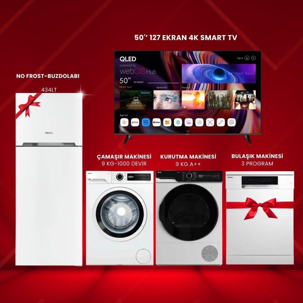 Regal 20267951 NF 48021 Beyaz Buzdolabı E0042452 Regal 20268726 CMI 90102 9 kg 1000 Devir Beyaz A sınıfı sessiz inverter motor Çamaşır Mk. E0042556 Regal 20265510 BM 313 3 Programlı, Beyaz, E Enerji sınıfı, Metal filtre Bulaşık Makinesi E0041074 Regal 20265491 KM 90433 9 kg A++ Çamaşır Kurutma Makinesi E0047660 Sunny SN50QMN252 50'' UHD 4K Webos 2.0 Qled Frameless Televizyon E0047732
