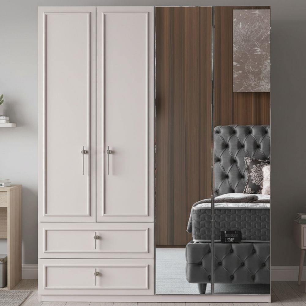 Mabel Gardırop'un modern çizgileri ve özel tasarım kulpları, sadece bir depolama birimi olmanın ötesinde, odanıza özgünlük ve şıklık katmaya yönelik özel bir tasarım sunar. Dört kapılı tasarımı, Mabel Gardırop'u geniş iç hacmi ile birleştirerek giyim ve aksesuarlarınız için düzenli bir depolama alanı sunar. Özel kaplama yüzeyi, çizilmelere karşı direnç gösterir, böylece uzun süreli kullanımda ilk günkü görünümünü korur.