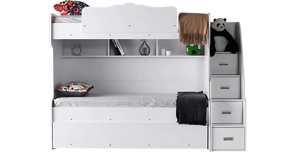 Sağlam merdiveni sayesinde üst yatağa güvenli çıkış imkânı sunar. Alt kısımda yer alan yavrulu yatak, hem ek yatak ihtiyacını karşılar hem de misafirler için pratik bir çözümdür. Beyaz rengin zarafeti sayesinde her dekorasyona kolayca uyum sağlar.