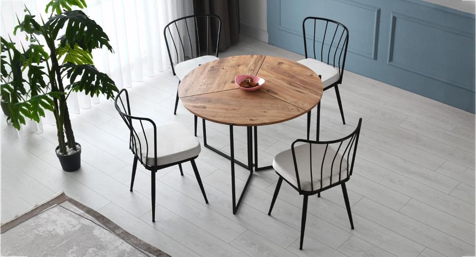 Hem yerden tasarruf sağlayan hem de estetik duruşuyla dekoratif katkı sunan Yaprak Masa Takımı, küçük evler, dar mutfaklar veya fonksiyonel alan arayanlar için mükemmel bir seçimdir.